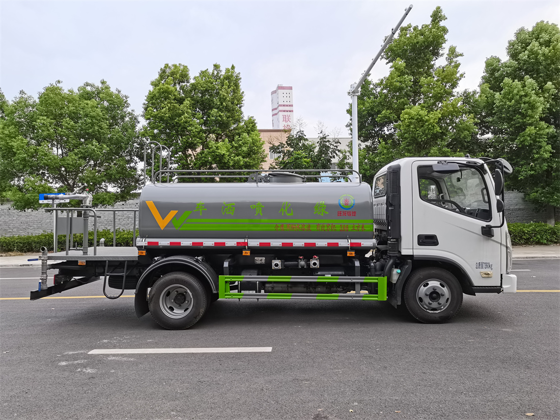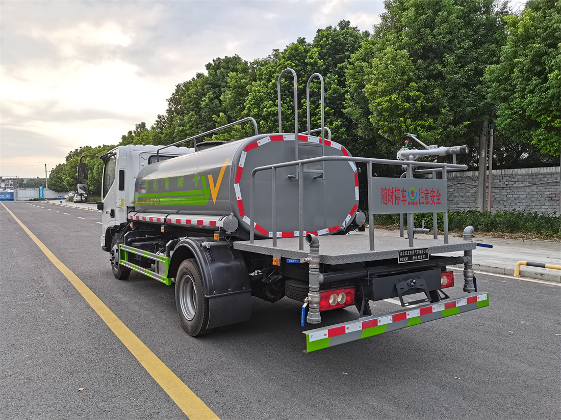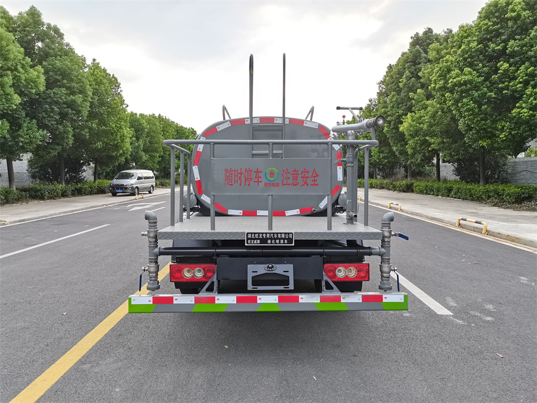 灑水車前裝有鴨形噴嘴或圓頭沖嘴,后面裝有圓柱開灑水噴嘴或蓮蓬頭噴嘴,后部有一工作平臺(tái),裝配有水炮。后部還可裝8個(gè)噴嘴(選裝)。