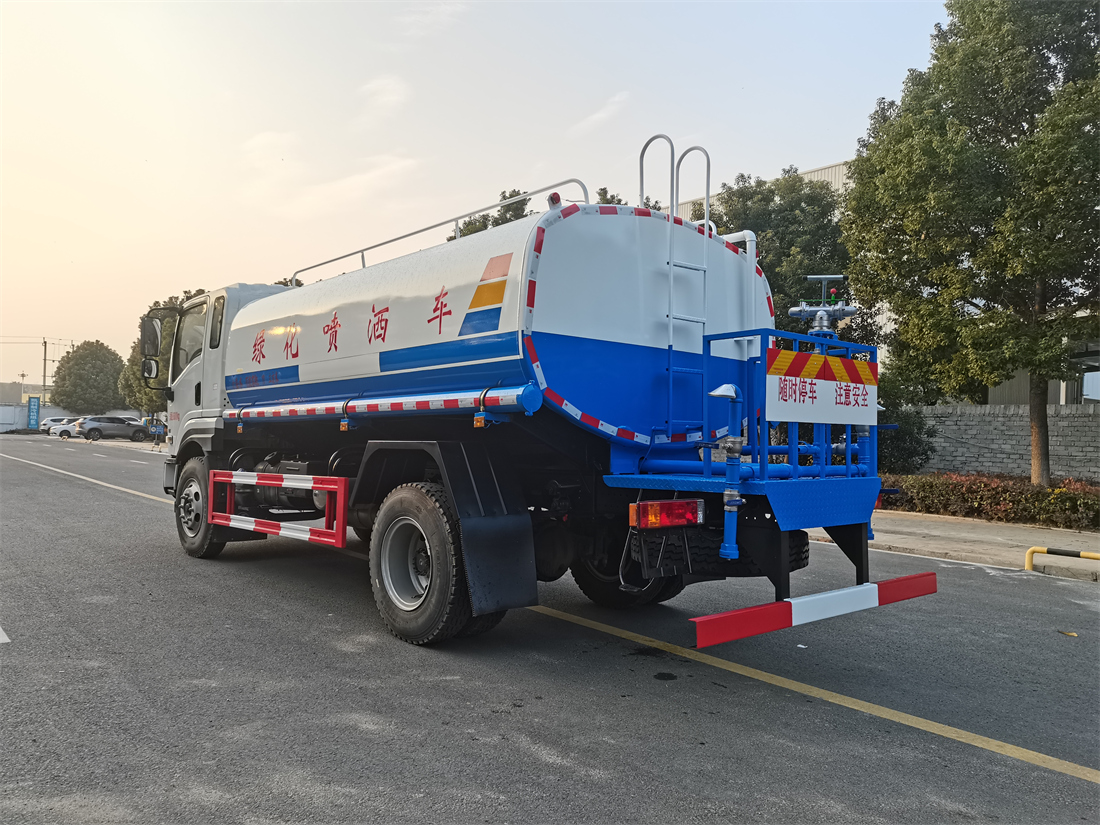 灑水車前裝有鴨形噴嘴或圓頭沖嘴,后面裝有圓柱開灑水噴嘴或蓮蓬頭噴嘴,后部有一工作平臺,裝配有水炮。后部還可裝8個噴嘴(選裝)。