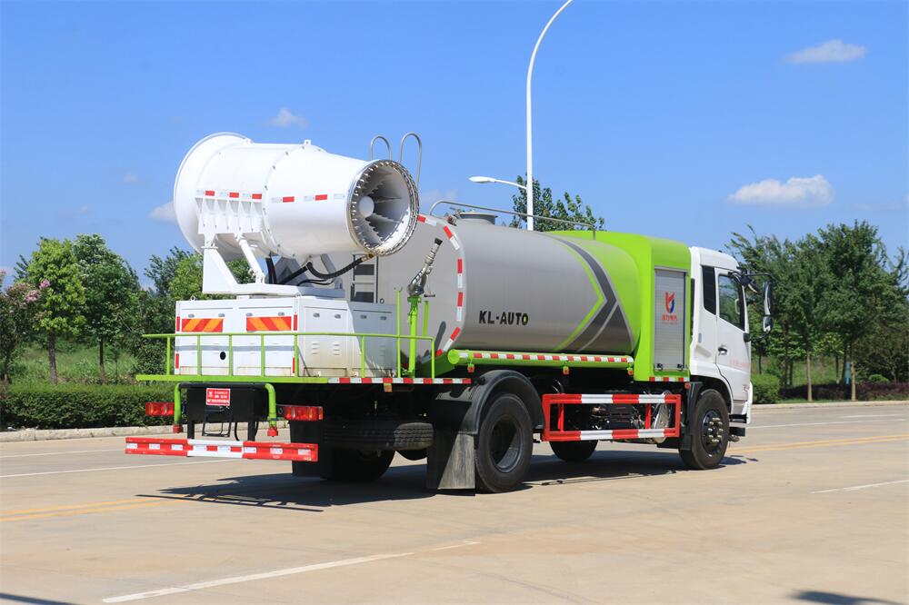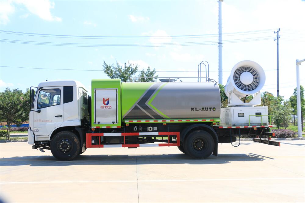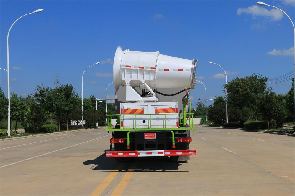 上裝配置:罐體容積為 12立方,選配風送式霧炮機組射程30米、40米、50米、60米、80米、100米、120米霧炮,罐體鋼板為4mm碳鋼Q235材質,罐內隔板具有防波作用,以減輕汽車行駛時罐體液體沖擊,罐體及整車外形尺寸按照公告。帶大功率專用灑水泵,泵可自吸自排,整車前沖、后灑、側噴、帶65消防接口,后平臺配CLW-50、CLW-60、CLW-80、CLW-100、CLW-120型風送式霧炮機組;罐體前封頭配大功率柴油發電機組;前封頭帶水位計,后平臺主管路帶1寸澆花接口,后爬梯。帶兩根輸水管及陰陽端。罐體顏色:銀/灰/綠,罐體兩側噴“多功能抑塵車”字樣,貼反光標示。