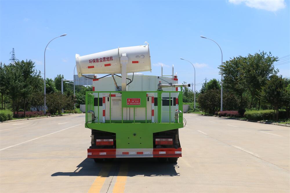 上裝配置:罐體容積為 16立方,選配風(fēng)送式霧炮機(jī)組射程30米、40米、50米、60米、80米、100米、120米霧炮,罐體鋼板為4mm碳鋼Q235材質(zhì),罐內(nèi)隔板具有防波作用,以減輕汽車行駛時(shí)罐體液體沖擊,罐體及整車外形尺寸按照公告。帶大功率專用灑水泵,泵可自吸自排,整車前沖、后灑、側(cè)噴、帶65消防接口,后平臺配CLW-50、CLW-60、CLW-80、CLW-100、CLW-120型風(fēng)送式霧炮機(jī)組;罐體前封頭配大功率柴油發(fā)電機(jī)組;前封頭帶水位計(jì),后平臺主管路帶1寸澆花接口,后爬梯。帶兩根輸水管及陰陽端。罐體顏色:銀/灰/綠,罐體兩側(cè)噴“多功能抑塵車”字樣,貼反光標(biāo)示。
