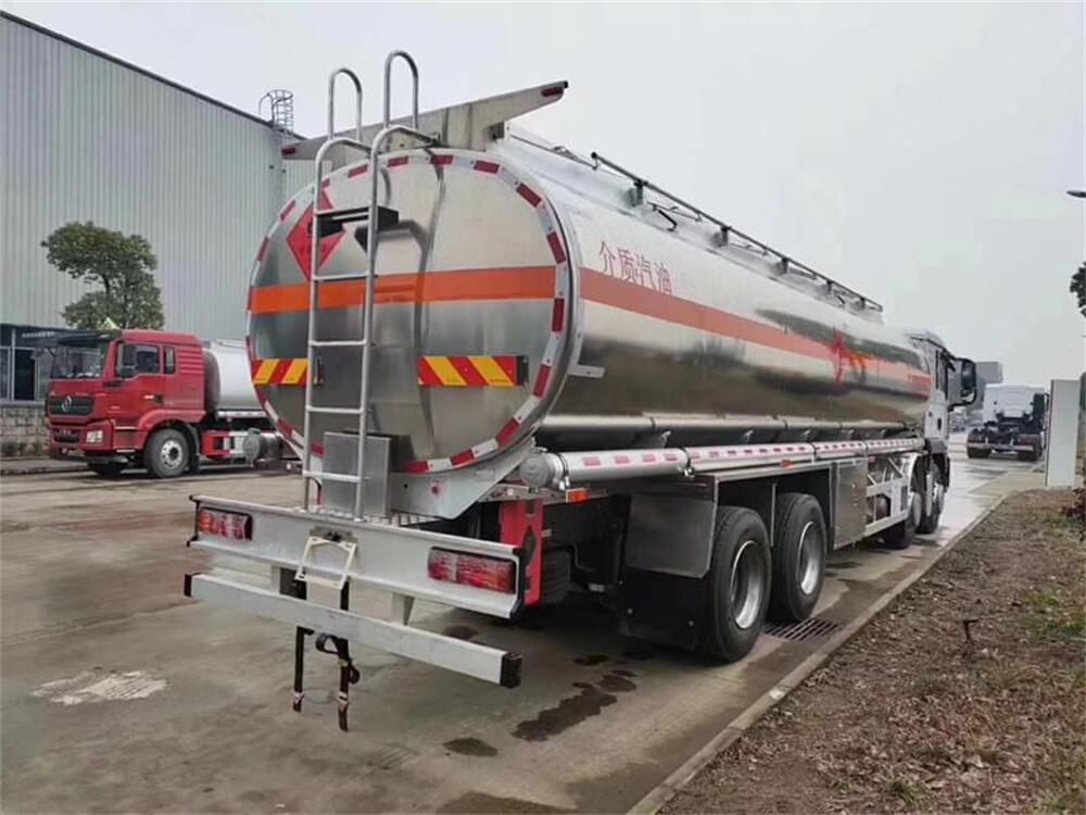 2.上裝配置:上裝采用國標(biāo)5083鋁合金板材,公告容積30.4(實際有效容積約32立方),標(biāo)配單倉,帶泵進(jìn)泵出,標(biāo)配兩個歐標(biāo)罐蓋和緊急切斷閥,帶歐標(biāo)全套下裝油系統(tǒng)(含下裝卸油閥、防溢流裝置和油氣回收裝置等),罐體頂部兩側(cè)帶折疊式升降防護(hù)欄,隨車配送兩根卸料軟管、陰陽端接頭、下裝油口轉(zhuǎn)換接頭等,其余均為廠家標(biāo)配。罐體油漆為銀粉色金屬漆,兩側(cè)及后封頭水平正中貼3M-1級橙色反光帶,反光板,貼“易燃液體”標(biāo)識,貼安全告示牌。