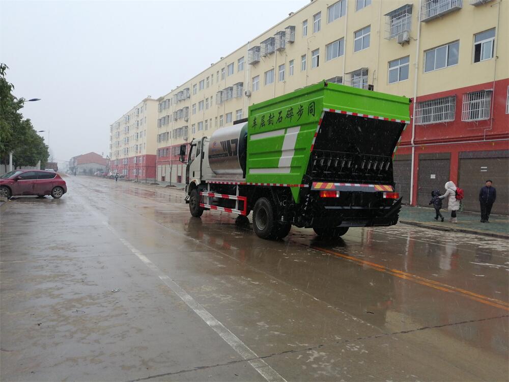 解放單橋同步碎石封層車工作實拍圖片