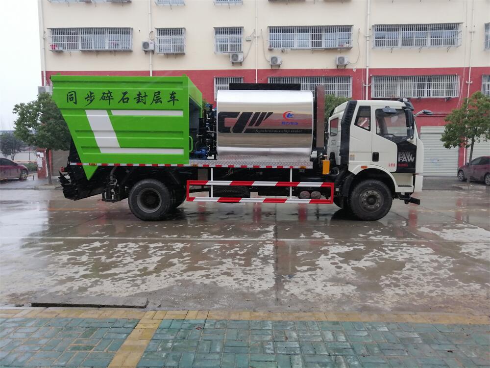 4、后雙橋同步碎石封層車完全采用電氣**,自動化程度高,,能**的計算出設備在施工過程中瀝青噴灑量和石屑撒布量的多少;
