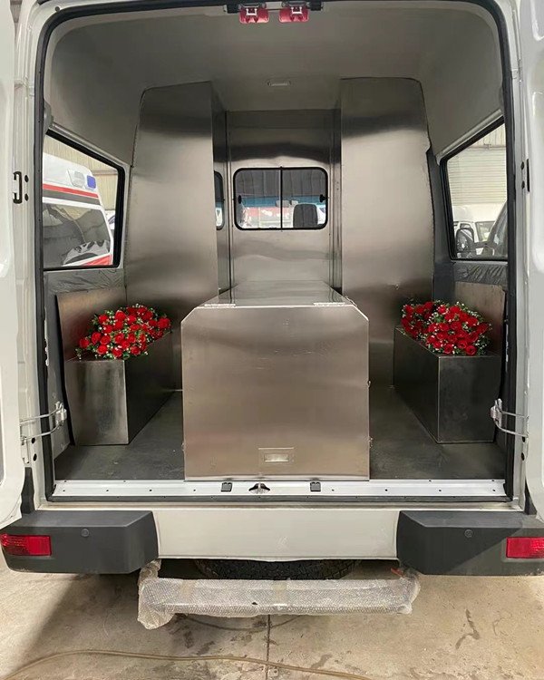 2. 改裝部分采用304L不銹鋼制作,中間不銹鋼隔墻安裝拉窗,不銹鋼地板,不銹鋼常溫棺不銹鋼擔架,加兩側玻璃下不銹鋼裝飾